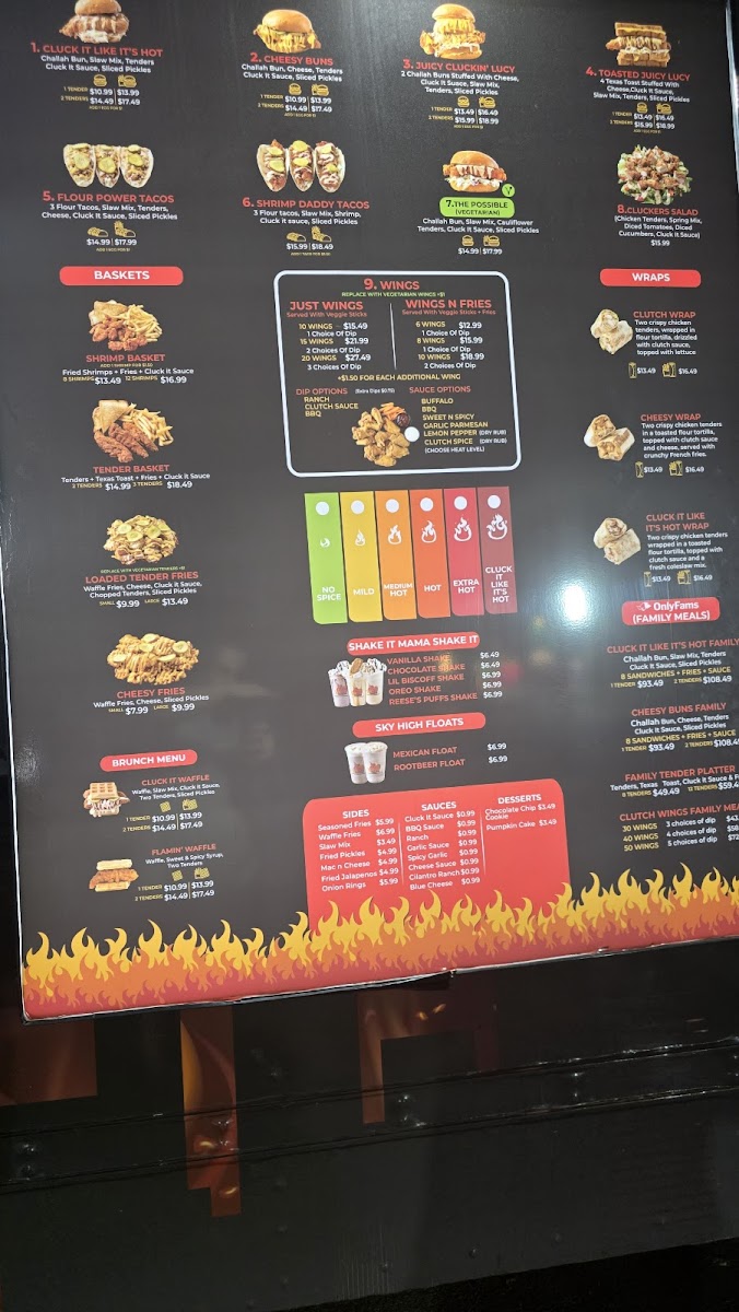 For those preferring baskets, CHEESY FRIES, LOADED TENDER FRIES, and TENDER BASKETS are favorites, while the SHRIMP BASKET and SHRIMP DADDY TACOS (3) bring a delicious seafood touch to the menu. And for brunch lovers, the CLUCK IT WAFFLE and FLAMIN' WAFFLE are exciting options to start your day.