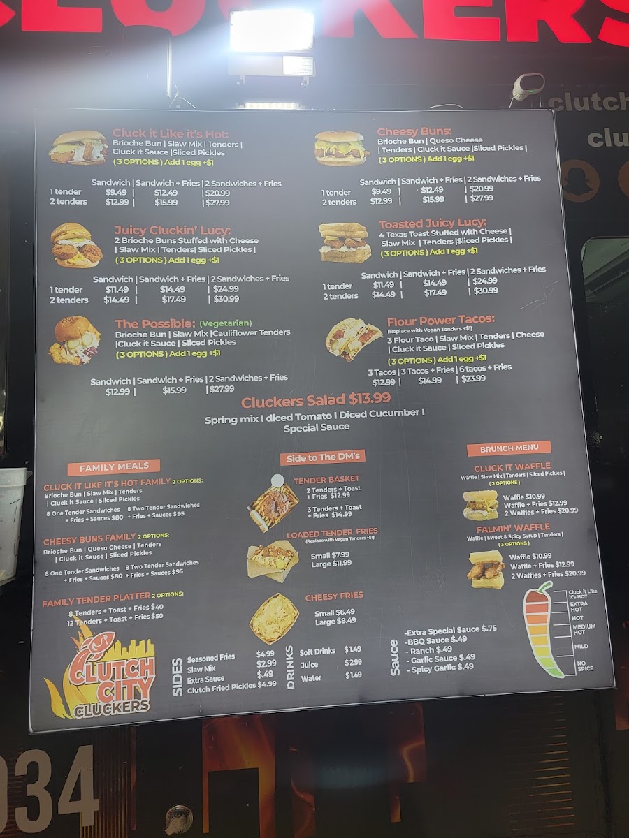 For sides, Seasoned Fries, Slaw Mix, and Clutch Fried Pickles are available, along with a variety of Sauces and the must-try Extra Special Sauce. The Item-Menu section offers fan favorites like CHEESY BUNS, CLUCK IT LIKE IT'S HOT, and the refreshing CLUCKERS SALAD, perfect for lighter meals. For something more indulgent, the JUICY CLUCKIN' LUCY and FLOUR POWER TACOS are popular choices.